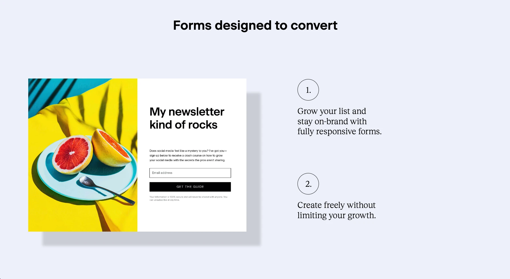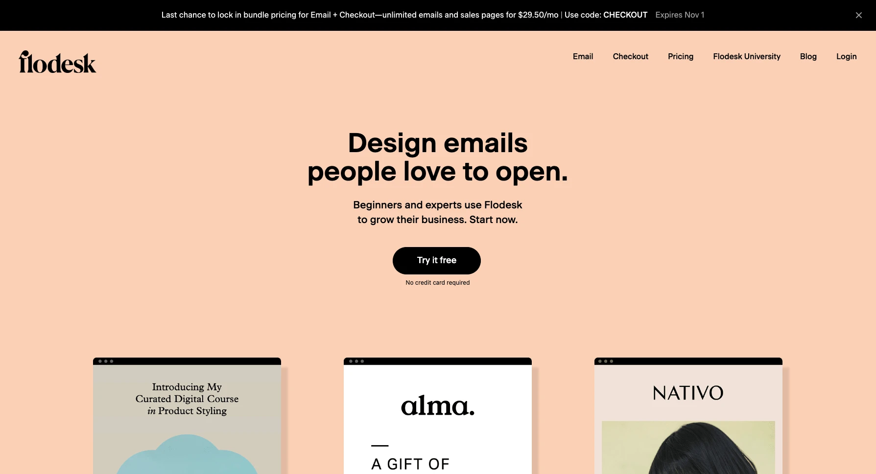 The first thing that caught my eye was the very deliberate and sensible use of open space. The design felt very spacious and although the examples of the app's offerings are "below the fold" there is an inviting feel to it. I was drawn in and immediately scrolled down to see the rest of the content. The heading are large and make the content easy to consume. The copy is easy to read and follow and provides a nice walk-through of what exactly flodesk offers and provides.